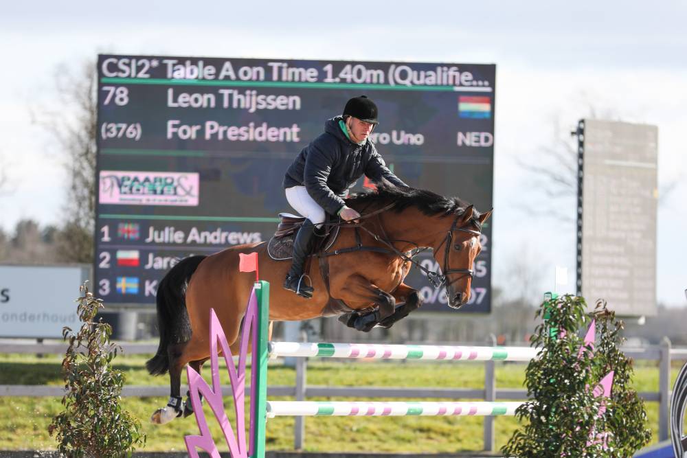 KRONENBERG –Leon Thijssen vertelt na afloop van het 1.40m dat hij alle drie de weken van de Spring Tour meerijdt op De Peelbergen. “Het is zo’n roteind weg, dat we dan maar drie weken blijven”, lacht de Limburger die op en steenworp afstand van het Equestrian Centre in Kronenberg woont. Met Numero Uno-telg For President legde de routinier het in de proef direct op tijd af tegen de Britse Julie Andrews. Patrick Lemmen was wederom de beste Nederlander in de GP-kwalificatie, een resultaat dat de ruiter uit Grashoek ook vorige week wist te behalen.