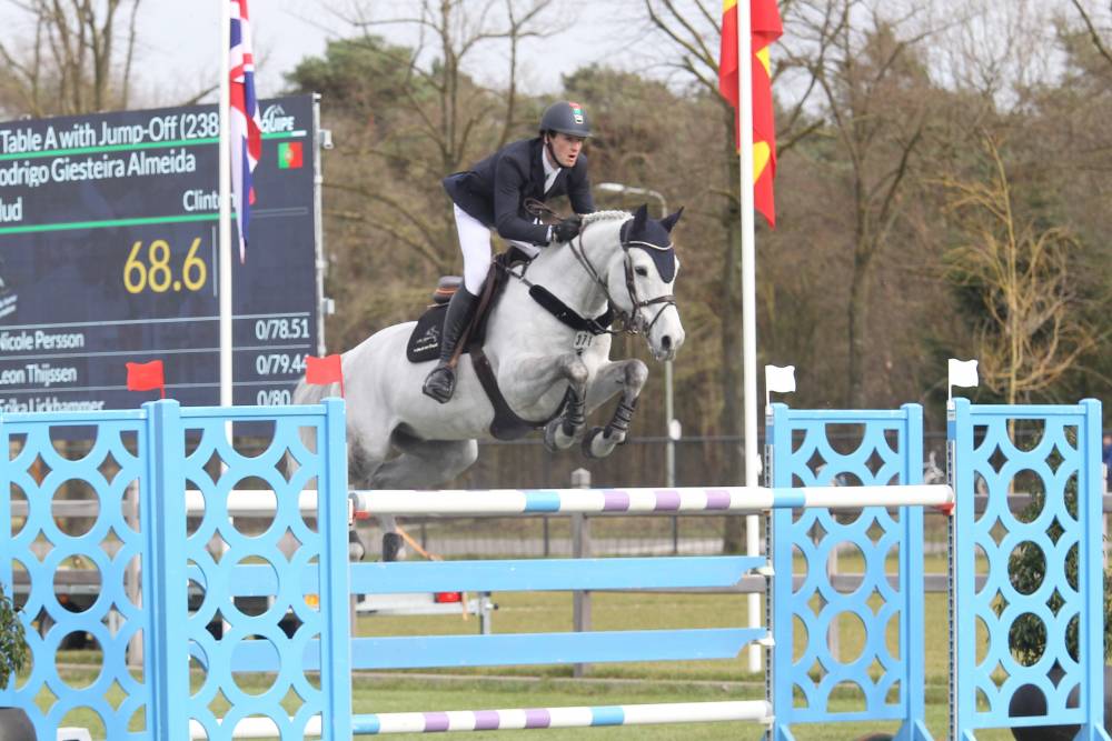 De zege in de 1.40m Medium Tour finale op Equestrian Centre de Peelbergen werd vanavond met verve bemachtigd door Portugees Rodrigo Almeida. De stalruiter van Stal Joppen reed met Elud (v. Clinton) ruim twee seconden sneller dan Nicole Persson met Charmeur Z (v. Champion F.P.). De Zweedse werd op hielen gezeten door de uiteindelijke nummer drie, Janika Sprunger uit Zwitserland. De Limburgse baas van Almeida, Loewie Joppen, grapt: “Nu hij zo’n sjiek horloge gewonnen heeft, komt hij hopelijk nooit meer te laat op stal”.